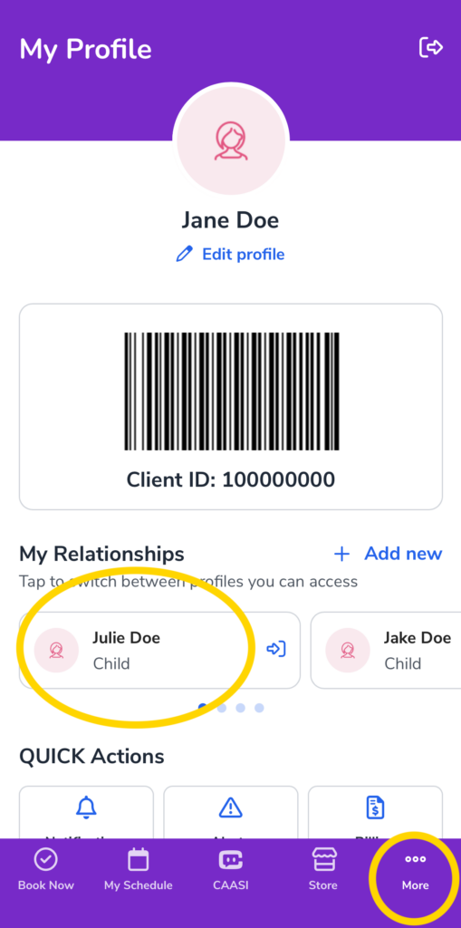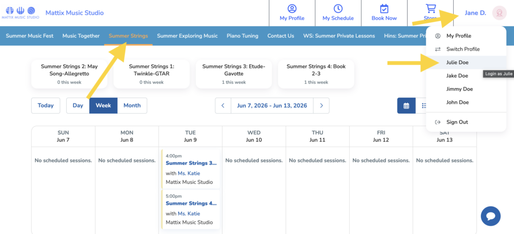 Be sure to select the correct student’s profile before you book the group class!